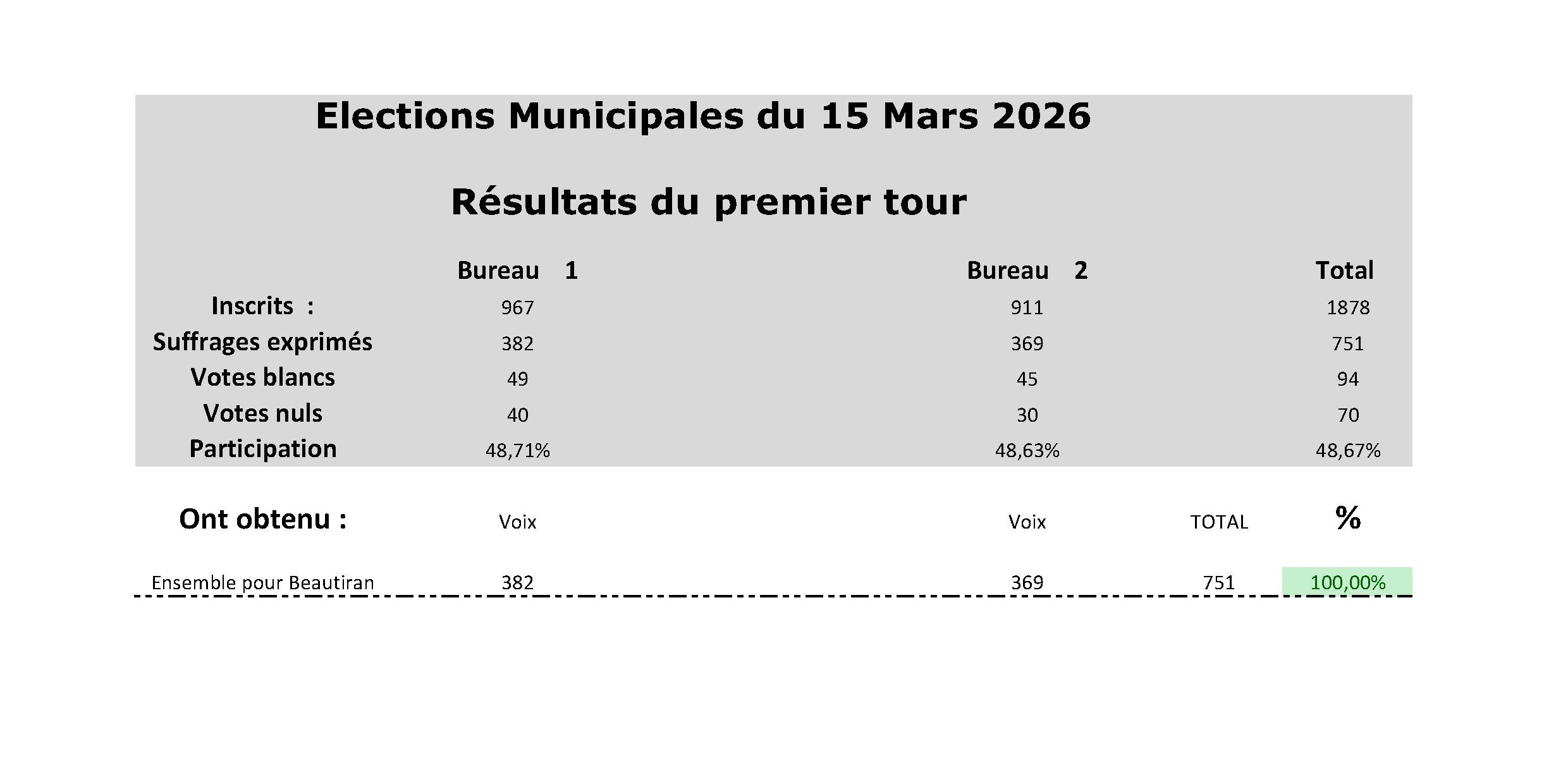 A l’issue du premier tour du scrutin des élections municipales, la liste « Ensemble pour Beautiran » a obtenu 100 % des suffrages exprimés.